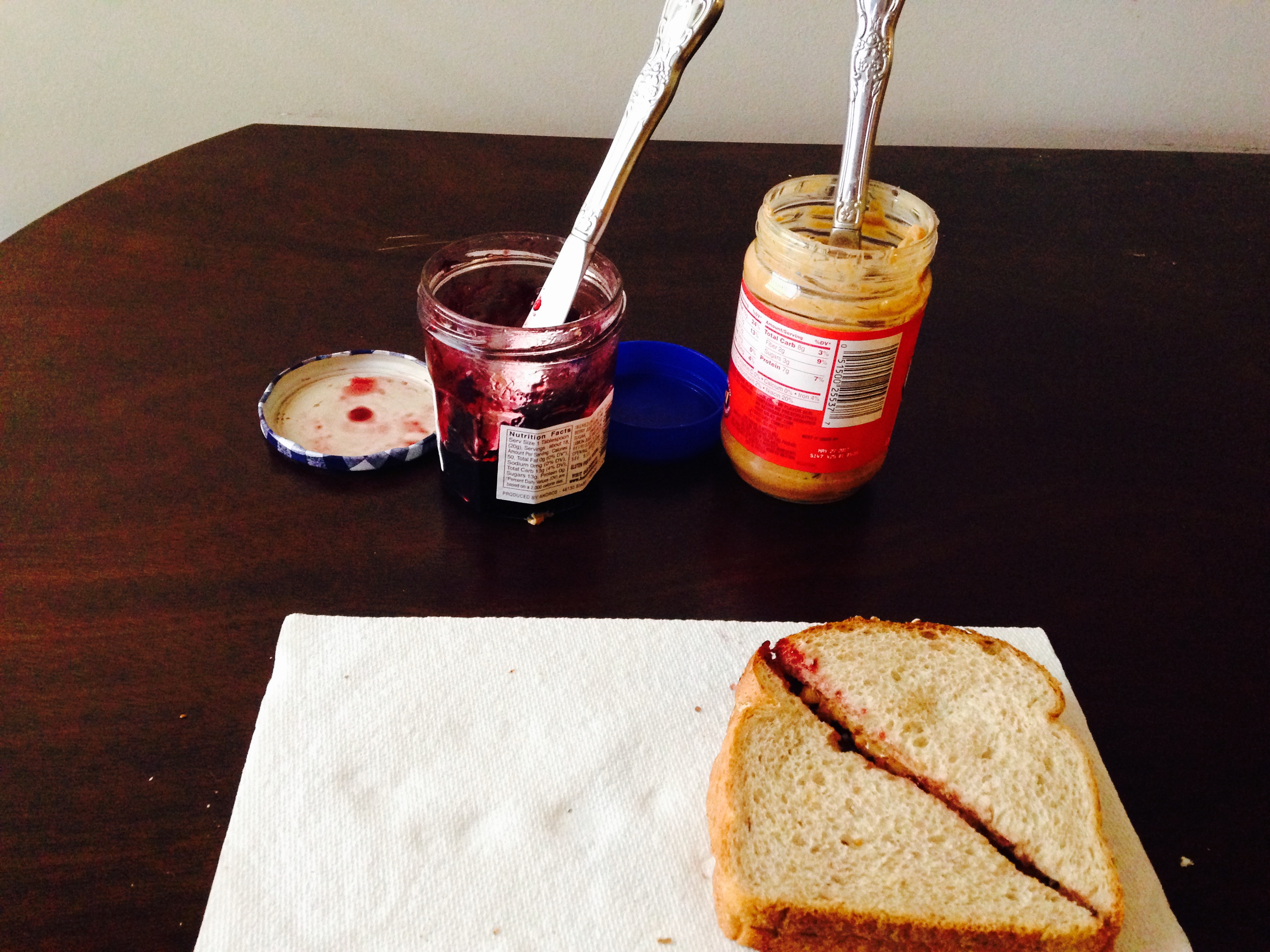 First of all, no white bread. Don’t waste your time with it. Wheat bread is tastier and healthier. Secondly, if you’re over the age of five and still have most of your teeth, crunchy peanut butter is a must. Exceptions can be made to households that have to accommodate the young and the toothless. Also, there should be no horizontal cuts. The triangle shape is perfect for the pb&j and anything else is just nonsense. A good cook also needs to have a variety of jellies on hand. Grape seems to be the most popular, but never trust anyone who only eats grape jelly. They have no imagination or sense of adventure. They’re probably sociopaths and you should keep an eye on them. Now, on to making the sandwich.