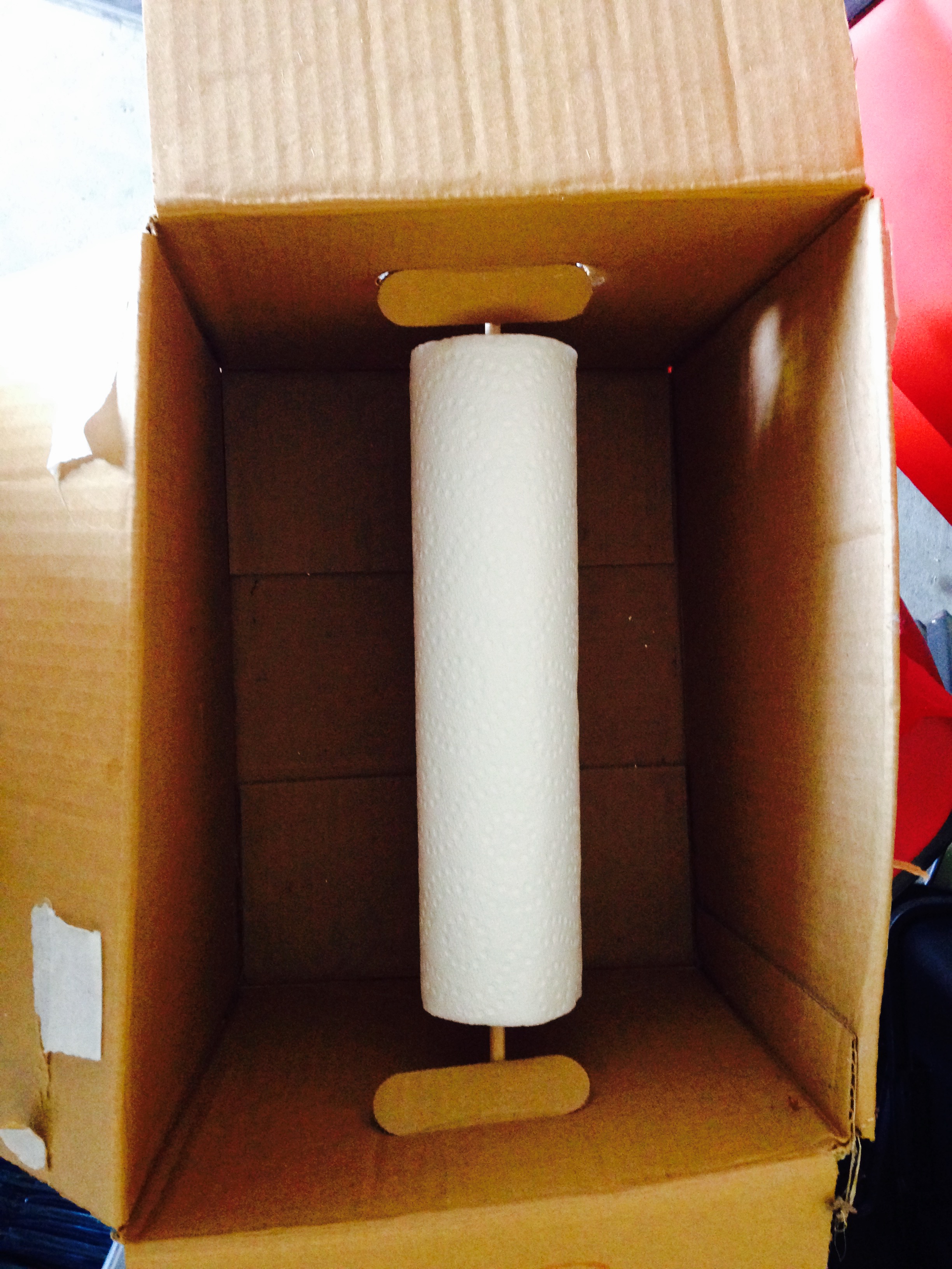 Then put your dowel rod through one of the holes, but not both. Next, slide the dowel rod through the center of your paper towel roll and then through the other hole in the box.
