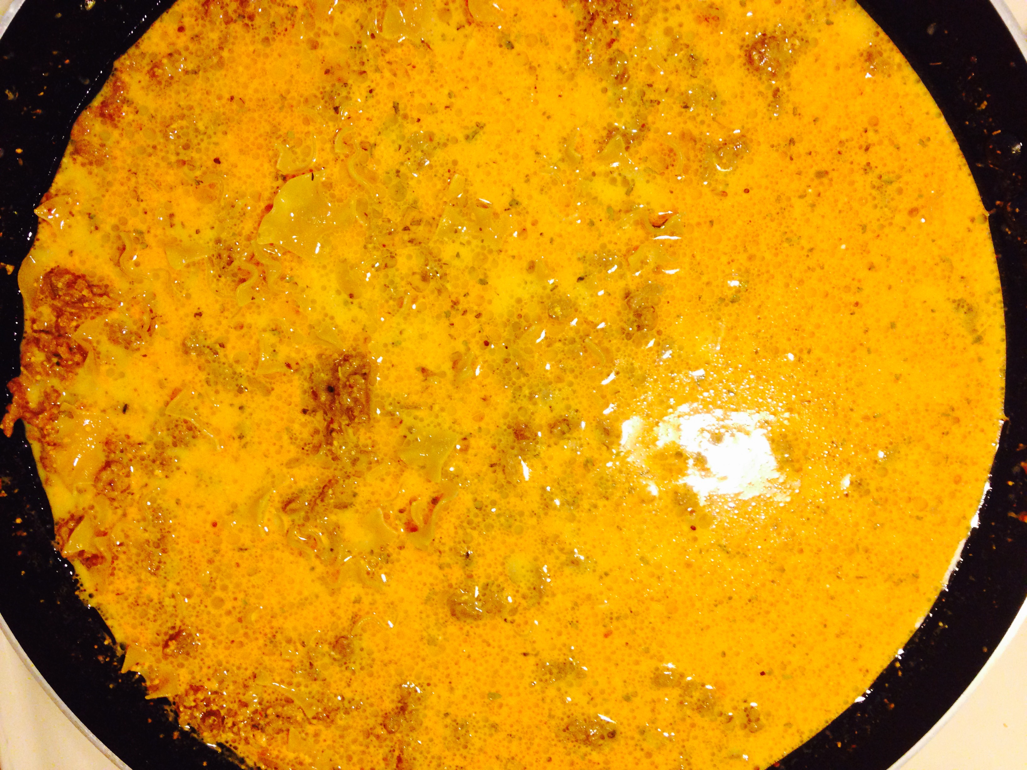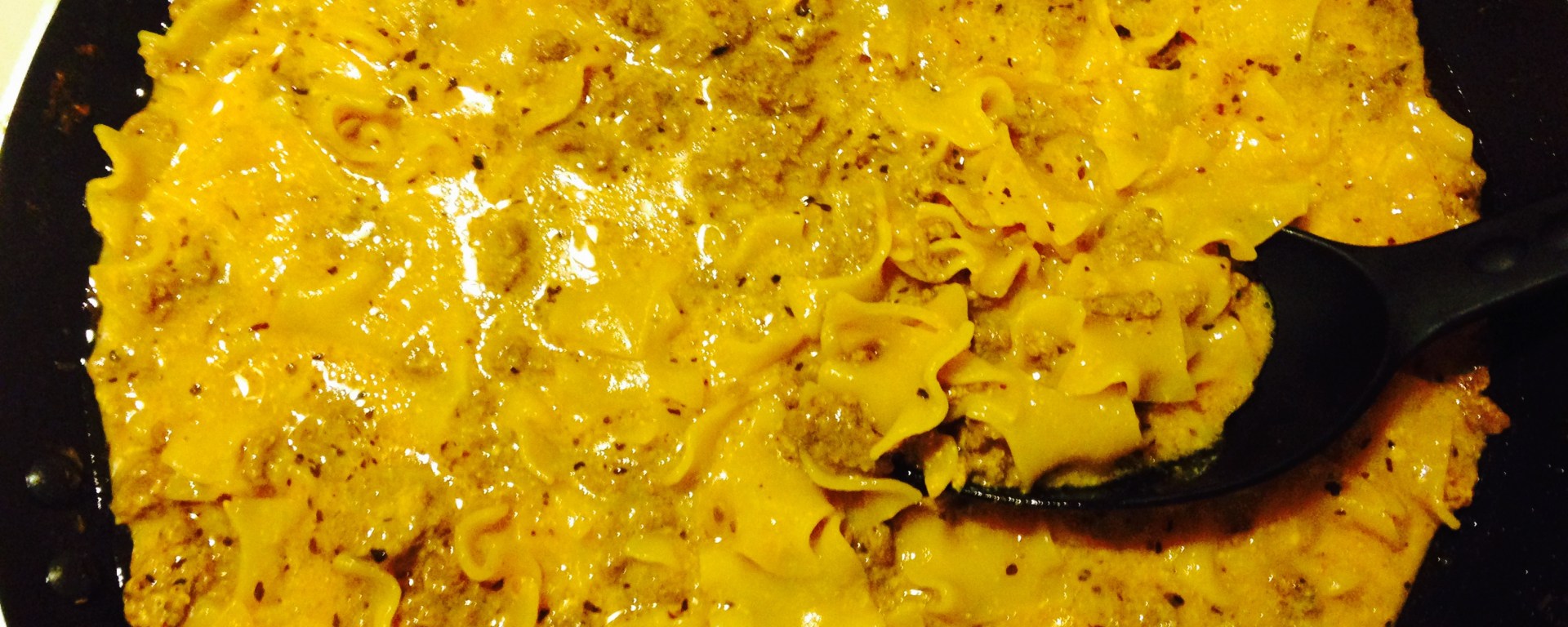 First, cook the ground beef. Put the meat in the pan and break it up into pieces while it cooks. When the meat is thoroughly cooked, mix in the water and the milk. Stir it up a little bit and then add the Hamburger Helper sauce mix and pasta. Stir it up to make sure all of the ingredients are mixed together. Bring it all to a boil. Once you get it boiling really good, turn down the heat and cover it up. Let it all simmer for about ten minutes. Stir it up every now and then while it’s cooking. It’s done when the pasta is good and tender. Add secret ingredient.